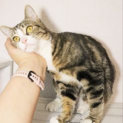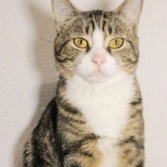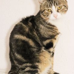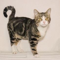 Котик Кай с мраморной серой шубкой и белым носиком готов переехать в новый дом.