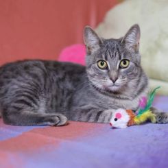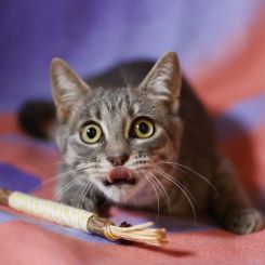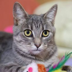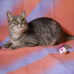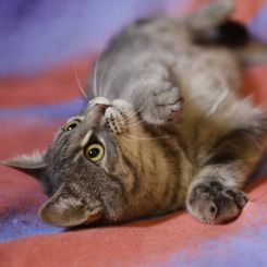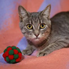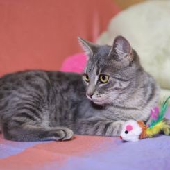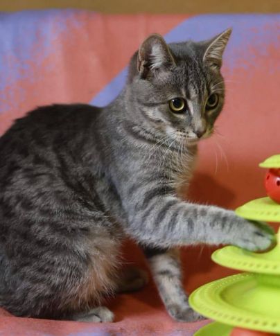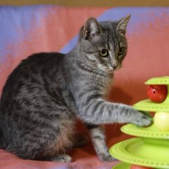 Здорова, вакцинирована, стерилизована. Чистюля и аккуратистка. Не промахивается мимо лотка. Уже научилась играть в игрушки, отдаёт предпочтение громыхающим мячикам и карусельке.