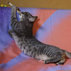 Дуняша вырастет довольно крупной, статной, длиннолапой, грациозной кошечкой. Уже сейчас она очень красива. Изящна, одета в шубку восхитительного голубого окраса с пятнышками и полосками, и с почти белой обводкой вокруг глаз, придающей еще больше выразительности взгляду. Невероятно хорошенькая и милая кошечка.