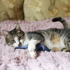 Кевася дружен с любыми кошками, котами, котятами. Не откажется от активных игр и догонялок с котовой молодёжью. Но и один вполне может себя занять. Любит наблюдать в окно за птичками. Обожает катать мячики и обниматься с игрушками с кошачьей мятой. А еще любит довольно большие меховые игрушки.