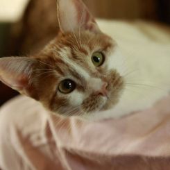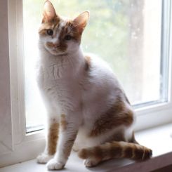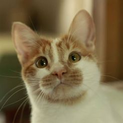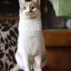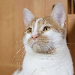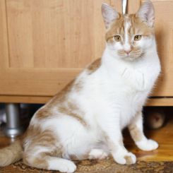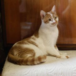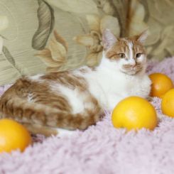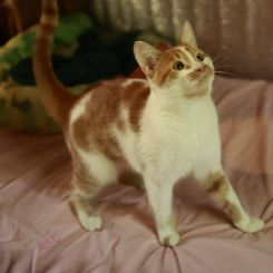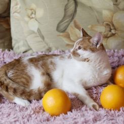 Апельсинка - очень маленькая, компактная кошечка, но очень хорошо сложена - длиннолапая, грациозная. У нее смешная, абсолютно круглая, как апельсин, головушка и интересный разрез глаз. И абсолютно невероятный окрас шубки - на белоснежном фоне россыпь апельсиново-оранжевых пятнышек, полосок, геометрически сложных клякс и даже сердечек.