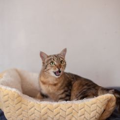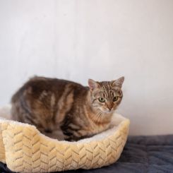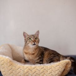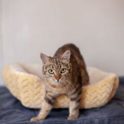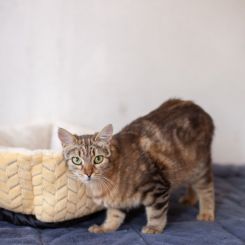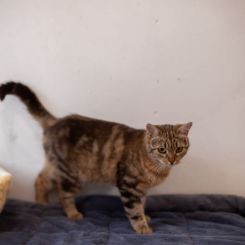 Аркона — утонченная и элегантная кошка с роскошным тигровым окрасом, чей облик подчеркивает природную грацию и внутреннюю гармонию. Мягкая и нежная, она источает ауру добра и тепла, неизменно вызывая восторг у окружающих. Несмотря на врожденную самоценность, Аркона умеет читать настроение и уважает личное пространство хозяина, никогда не пытаясь навязать свое общество, если замечает, что человек занят или утомлён.